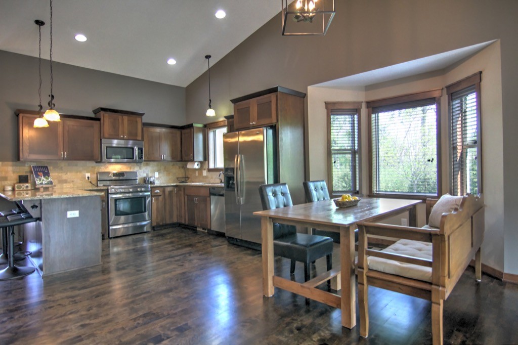 - Kitchen – granite countertops, stainless steel appliances, custom cabinets